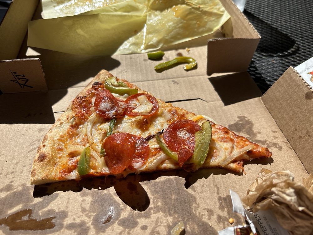 Marinara sauce, spicy sausage, mushrooms, red peppers, onions, and garlic.